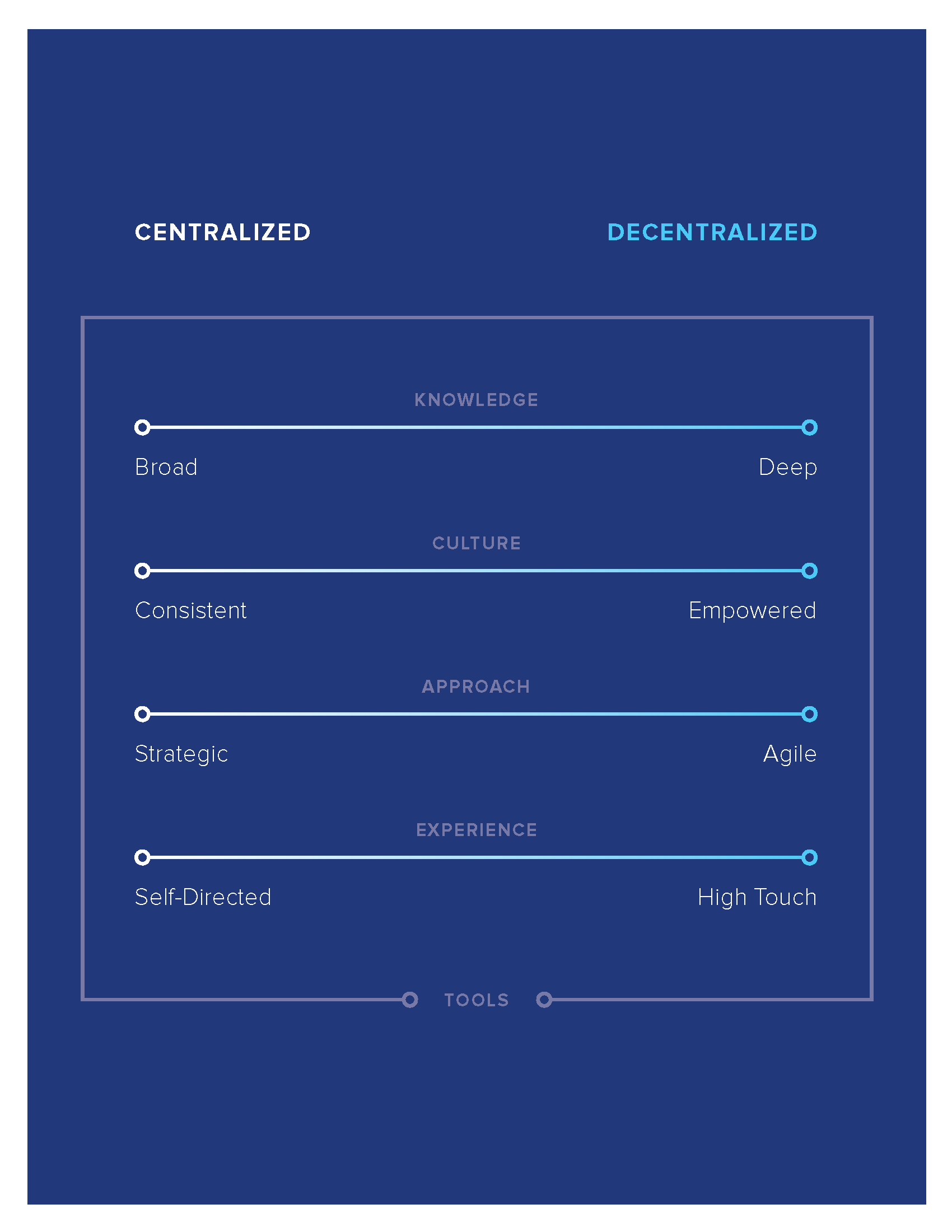 This framework has four overarching areas that an organization thinks about from a transformation perspective while thinking of a new service—knowledge, culture, approach, experience, and tools. Example, if an organization wants to develop a self directed experience, then the service is best centralized, and so on. But we also learnt that several organizations also end up being hybrids. Thus, in addition to specifically clear examples, each category has an ‘outlier’ as a hybrid.